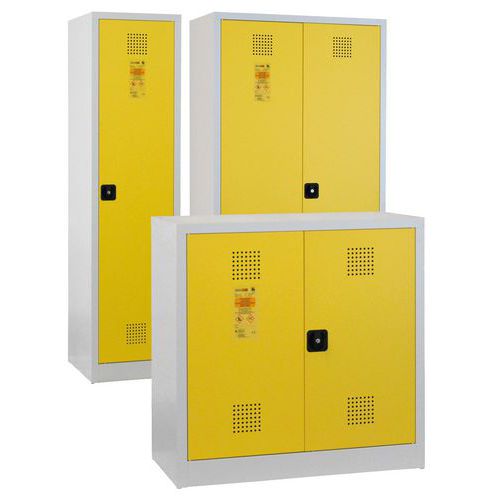 - Skapet har en robust, enkelvegget stamme i pulverlakkert stål (RAL 7035 – lysegrå) og dører i RAL 1018 – sinkgul for tydelig sikkerhetsmerking.