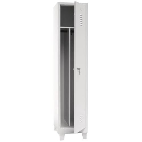 Dører som forsterkes med usynlige hengsler. Optimal åpning på 180°. Hygienisk: ventilasjon oppe og nede på klesskapdørene. 1 skillevegg for rene og skitne klær. 1 hylle, 1 stang og 2 kroker per rom. Hull for veggmontering. Stemplet etikettholder.