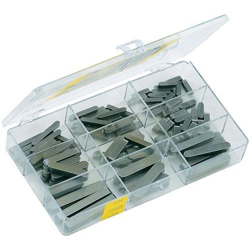 | Varenavn | Koffert med assorterte parallelle kiler, Antall deler: 90, Materiale: Stål, Antall rom: 9, Modell: Parallell |