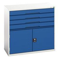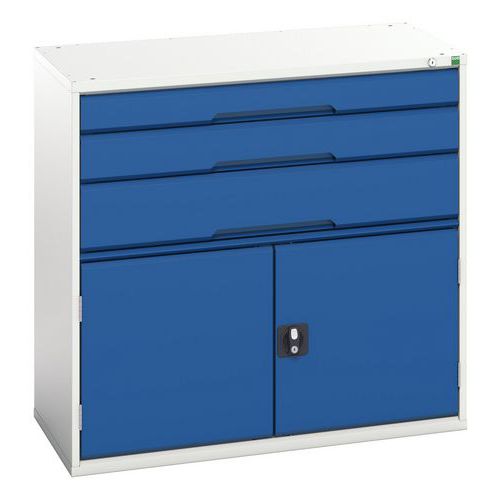 Kombinert skap laget av sveiset stålplate med forsterkninger for bruk i industrielle miljøer. Skuffer montert på rulleskinner som tåler en belastning på 60 kg. Enkel åpning og lukking, selv når de er fullastet. Skuffer lukkes med sentrallås. Enkel dybde på 550 mm. Sikkerhetsråd: - plasser møbelet på en flat overflate - fest det til en vegg eller skillevegg med egnede fester - pass på at du ikke overskrider den maksimalt anbefalte belastningen, samt at den er godt fordelt. Produsert i Storbritannia Maksimal last (kg) : 1000 Maksimal vekt per hylleplan (kg) : 75