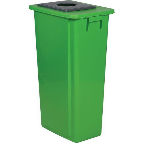 80-liters beholder for sortering av papir, emballasje og glass (velg lokk for avfall å resirkulere). Enkel flytting og håndtering av beholdere takket være håndtak. Kompakt eksteriør gjør beholderen perfekt for sortering av avfall innendørs - bygg din egen resirkulering med flere forskjellige beholdere. Fargede lokk med forskjellige typer åpninger indikerer en enkel måte hvilken beholder hver type avfall skal kastes i.