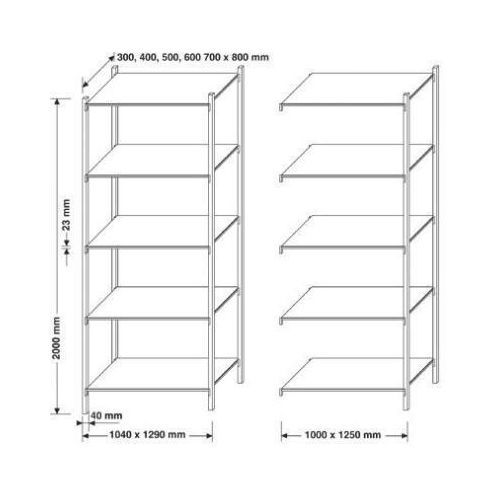 - Påbyggingsseksjon: består av 2 stolper med plastføtter, 5 hylleplater av rørprofiler, 5 dekkplater av trefiberplater.