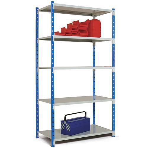 - Lagerhylle Combi-Flip Steels grunnseksjon består av fire stolper med plastføtter og fem hylleplater, stålhyller som er lette å montere.