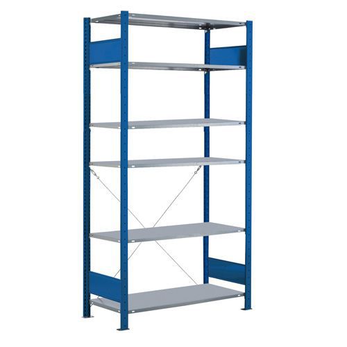 Lagerhylle Easy-Fix blå grunnseksjon: består av fire stolper, koblinger, stolpeføtter, en krysstang og fem, seks eller sju hyller. Problemfri og rask montering uten skruer eller spesialverktøy. Svært stabil konstruksjon med et stativ som kan belastes med opptil 1800 kg, og takket være spesialkonstruksjonen kan hyllene belastes med 25 % mer enn vanlig konstruerte hylleplater. Lagerhyllen er tilgjengelig i tre forskjellige konfigurasjoner av høyde og fem forskjellige konfigurasjoner av dybde. Stolpe, farge: Blå, RAL 5010.