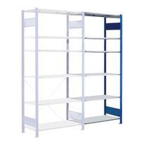 - Lagerhylle Easy-Fix blå: Påbyggingsseksjon består av 2 stolper, koblinger, stolpeføtter, 1 krysstang og 5, 6 eller 7 hyller.