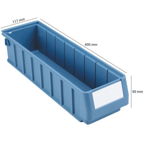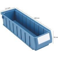 Lagerkasse RK 400 mm, Volum: 2.7 L, Totalhøyde: 90 mm, Totalbredde: 117 mm, Totallengde: 400 mm, Farge: Blå Lagerkasse RK 400 mm, Volum: 2.7 L, Totalhøyde: 90 mm, Totalbredde: 117 mm, Totallengde: 400 mm, Farge: Blå