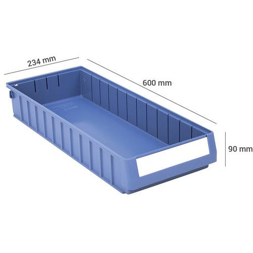 Lagerkasse RK 600 mm, Volum: 9.4 L, Totalhøyde: 90 mm, Totalbredde: 234 mm, Totallengde: 600 mm, Farge: Blå Lagerkasse RK 600 mm, Volum: 9.4 L, Totalhøyde: 90 mm, Totalbredde: 234 mm, Totallengde: 600 mm, Farge: Blå