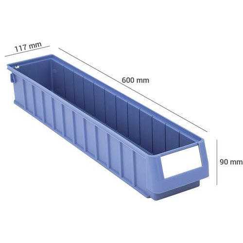 Lagerkasse RK 600 mm, Volum: 4.2 L, Totalhøyde: 90 mm, Totalbredde: 117 mm, Totallengde: 600 mm, Farge: Blå Lagerkasse RK 600 mm, Volum: 4.2 L, Totalhøyde: 90 mm, Totalbredde: 117 mm, Totallengde: 600 mm, Farge: Blå