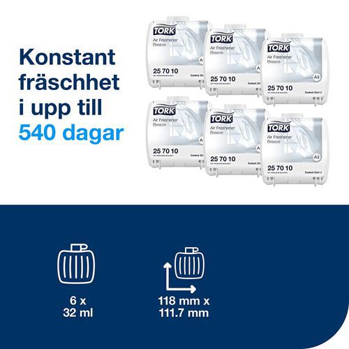 - Passer med Tork Airfreshener Dispensere som er Easy to use-sertifisert for rengjøringspersonalet.