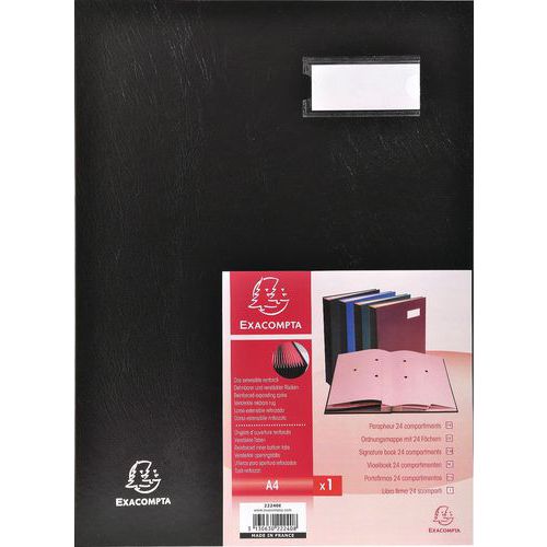 | Varenavn | Management underskriftsbok med sidebrettet rygg, Antall divisjoner: 24, Farge: Svart, Materiale: Papp |