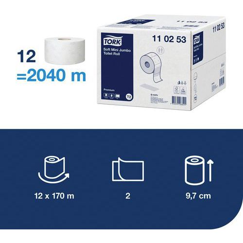 Mini og Maxi Jumbo Tork Premium toalettpapir, Lag: 2, Rull, lengde: 1700 cm, Farge: Hvit, Type produkt: T2 Mini og Maxi Jumbo Tork Premium toalettpapir, Lag: 2, Rull, lengde: 1700 cm, Farge: Hvit, Type produkt: T2