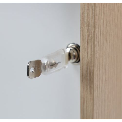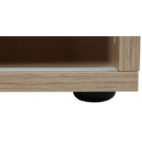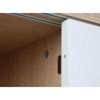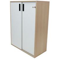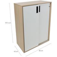 Skap med skyvedører laget av 18 mm melamin med 1 mm kanter – perfekt for kontorer. 25 mm hylle som tåler en belastning på opptil 32 kg. Montert på hjul, noe som gjør skapet lett å flytte. Utstyrt med nøkkellås. 60 mm høye metallprofilhåndtak.