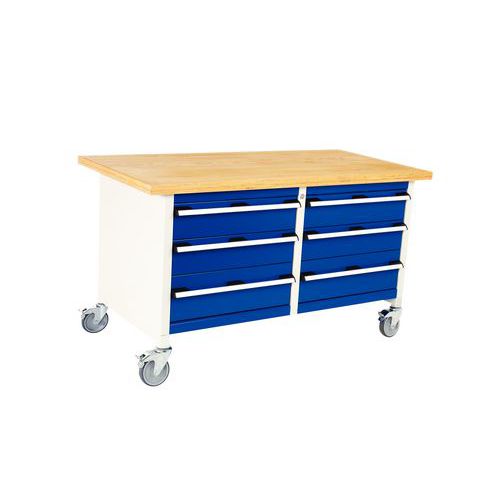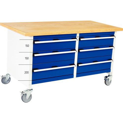 | Varenavn | Mobil monoblokk arbeidsbenk med skuffer, Totalhøyde: 840 mm, Antall skuffer: 6, Totalbredde: 1500 mm |