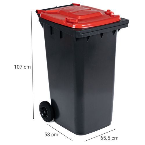 Økonomisk 240L plastavfallsbeholder på hjul med en rekke fargede lokk for enkel avfallshåndtering. UV-bestandig beholder. Enkel bevegelse av beholderen takket være disse 2 solide hjulene. Enkelt vedlikehold av beholderen takket være den glatte plastoverflaten. Lokk i ulike farger for å lette avfallssortering. For utendørs bruk