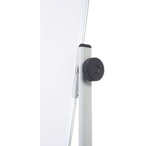 Whiteboarden har en elegant aluminiumsramme og står på et stativ med fire låsbare hjul for enkel forflytning og sikker plassering.