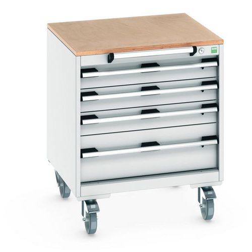 Skuffer med sikkerhetslås, lastekapasitet 50 kg. Modeller med en høyde på 785 mm kan oppbevares under en bott cubio arbeidsbenk for å bli et mobilt skap. 4 hjul - 2 faste, 2 svingbare med brems.