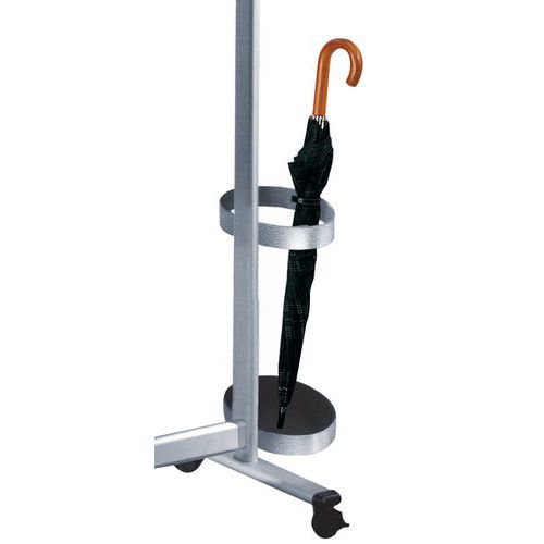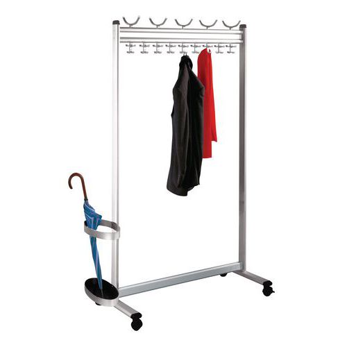 Klesstativ av finere kvalitet med svært høy kapasitet, aluminium. Klesstang utstyrt med kroker for luer og klær. Klesstativet er mobilt takket være de 4 hjulene, som kan låses individuelt. Paraplystativet kan tilføyes som du vil på høyre eller venstre side.