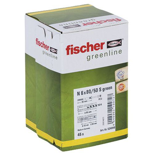 | Varenavn | N Grønn bankeplugg 6 80 50 S, Plugglengde: 80 mm, Ø: 6 mm, Materiale: Nylon, Type støtte: Tre |