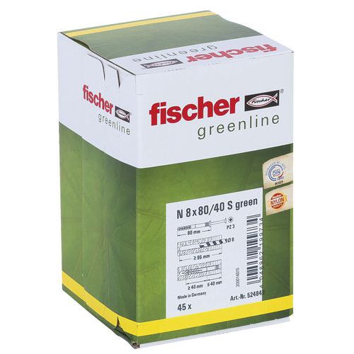 | Varenavn | N Grønn bankeplugg 8 80 40 S, Plugglengde: 80 mm, Ø: 8 mm, Materiale: Nylon, Type støtte: Tre |