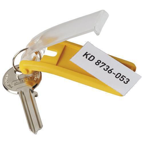 Praktisk nøkkelring/ brikke som gjør det enkelt å holde orden på nøkler. Brikken kan enkelt åpnes for utskifting av etikett uten at du trenger ta bort nøkkelen. Innstikket måler 17 x 40 mm (BXH). Yttermål på brikke: 25 x 65 mm (BXH). Tilbehør til Nøkkelskap Durable Key Box. Produsert i EU