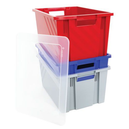 Beholder som kan stables med åpne håndtak for enkel håndtering.