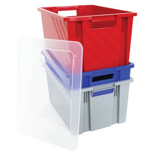 Beholder som kan stables med åpne håndtak for enkel håndtering. Utmerket mekanisk og kjemisk motstand. Stort overflateareal for utmerket stabilitet ved stabling. Forsterket struktur for økt stivhet.