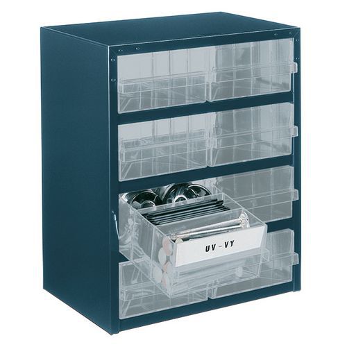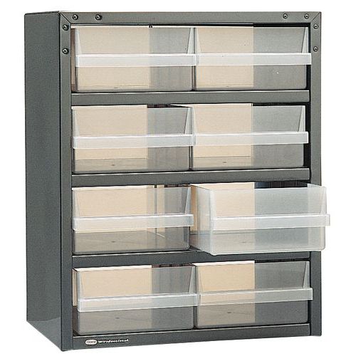 | Varenavn | Oppbevaringsskap for små deler 250-serien, Materiale: Stål, Totalhøyde: 435 mm, Totalbredde: 360 mm |