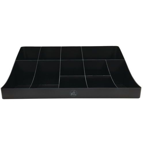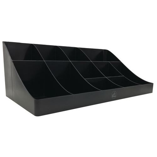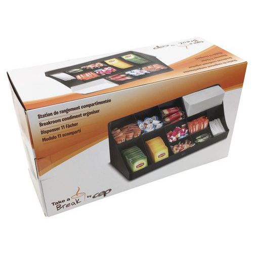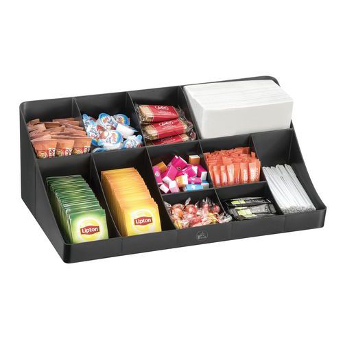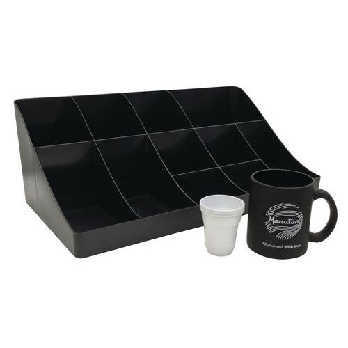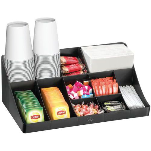 11 rom for å oppbevare alt nødvendig tilbehør ved siden av kaffetrakteren, vannkokeren (servietter, kopper, skjeer, sukker, teposer, etc.).