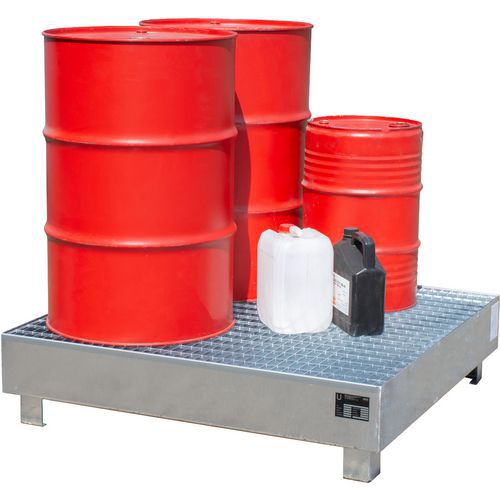 | Varenavn | Oppsamlingskar, galvanisert med rist, Kapasitet (antall fat): 4, Rutenett: ja, Retensjonskapasitet: 255 L |