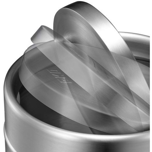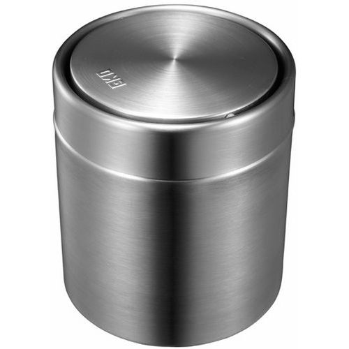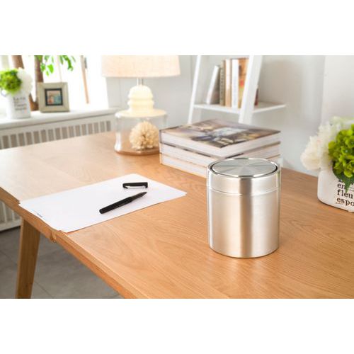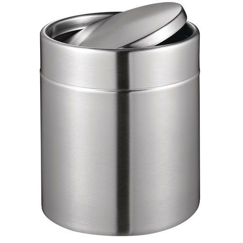 Et vakkert design for denne lille bordavfallsbeholderen laget av matt rustfritt stål.