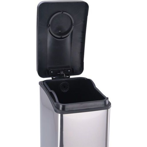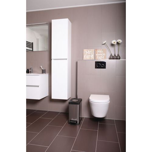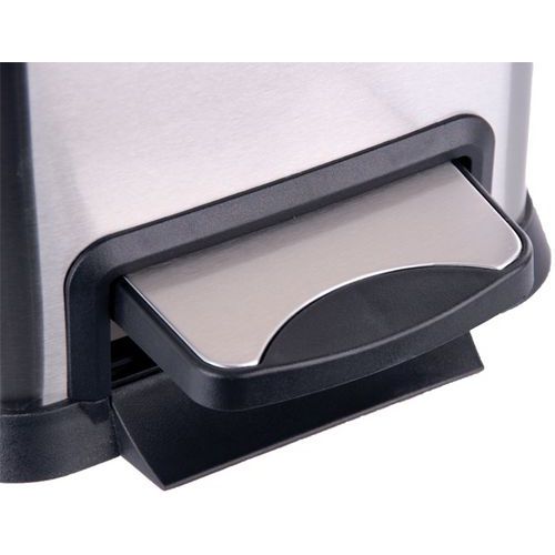 Rektangulær pedalbøtte laget av matt rustfritt stål med fuktet plastlokk og innvendig plastbeholder.