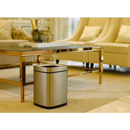 Firkantet avfallsbeholder laget av matt rustfritt stål med åpen inntaksåpning på toppen.