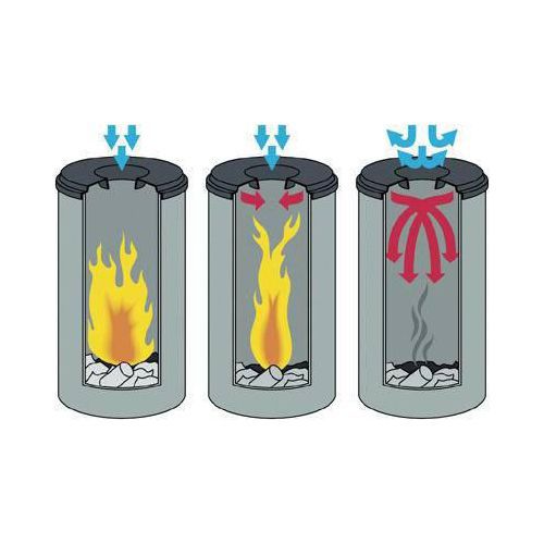 - 2. Forbrenningsgassene stenges i beholderen pga lokket.