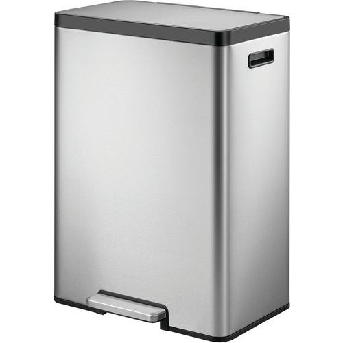 Rektangulær pedalbøtte laget av børstet rustfritt stål med fingeravtrykksikkert belegg og praktiske plasthåndtak.
