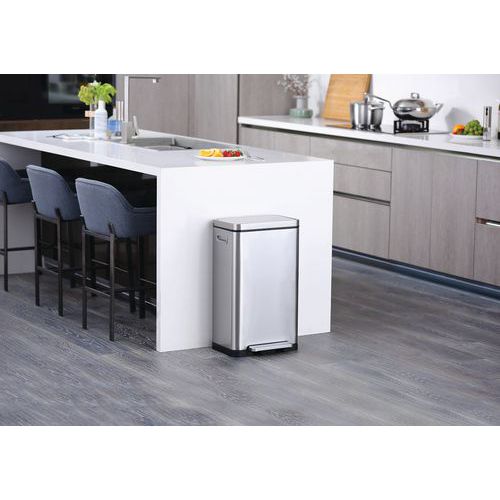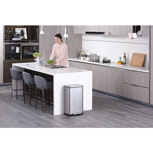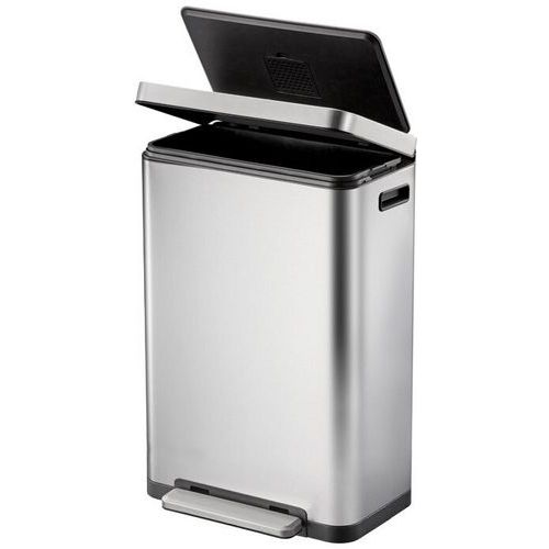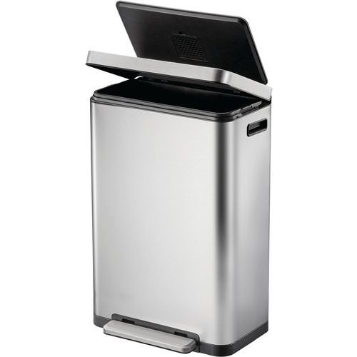 Stilig rektangulær pedalbøtte med ekstra bred pedal, innerbøtte i plast, mykt lukkende lokk og holde-åpen funksjon. Pedalbingen av børstet rustfritt stål er utstyrt med fingeravtrykksikkert belegg og antibakterielt belegg i nanosølv. Silikontetningsringen sørger for effektiv oppbevaring av ubehagelige lukter i avfallsbeholderen. Det er også innebygd luktfilter i lokket. Den sammenleggbare kanten holder beholderen åpen for enkel utskifting av avfallsposen og/eller fjerning av innerbeholderen.