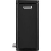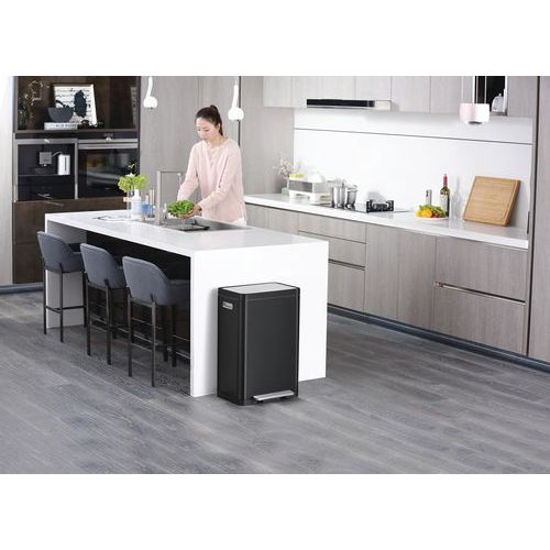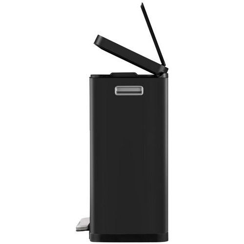 Stilig rektangulær pedalbøtte med ekstra bred pedal, innerbøtte i plast, mykt lukkende lokk og holde-åpen funksjon.