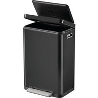 Elegant rektangulær søppelbøtte med ekstra bred pedal, syntetisk liner, stille lukkelokk og stay-open-funksjon.