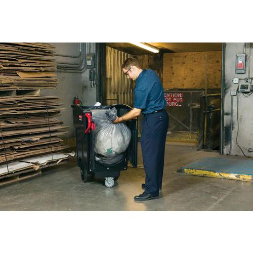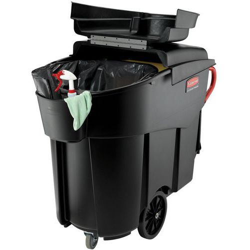 En mobil og lettmanøvrert beholder for avfall og lin med integrert poseholder.