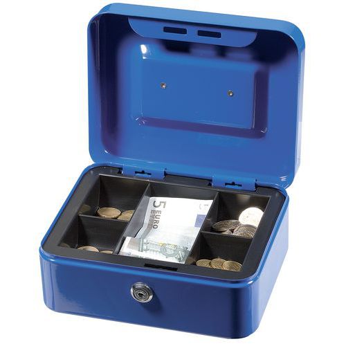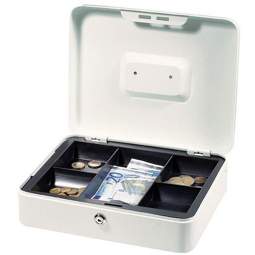Kontantboks med epoksyfinish. Svart plastskje med rom. Krom metallhåndtak. Sikker lås.