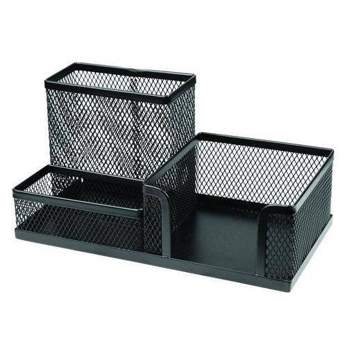 - Solid penn- og tilbehørsholder i trådmetall med tre rom for penner, sakser og små kontorartikler.