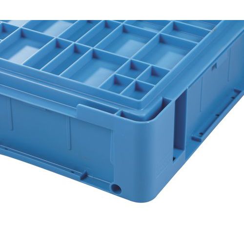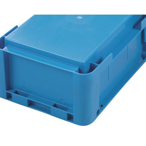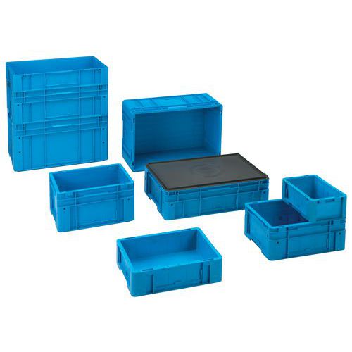 Overholder europeiske standardmål. God slagstyrke og stabil ved stabling takket være forsterkede sider og bunn samt hjørner med doble vegger. Eurotec-kasse med ergonomiske håndtak som gjør den enkel å bære. Egnet for ulike typer automatisert håndtering: roboter, transportbånd, butikker og lasting. Enkel identifisering med etikettholder.