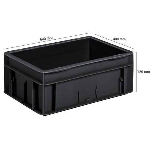 Ledende material gjør at den tåler elektrostatiske utladninger. Meget god motstand mot slag og annen mekanisk deformasjon. Antistatisk kasse med europeiske standardmål for enkel lasting. Beskytt sensitive elektroniske komponenter.