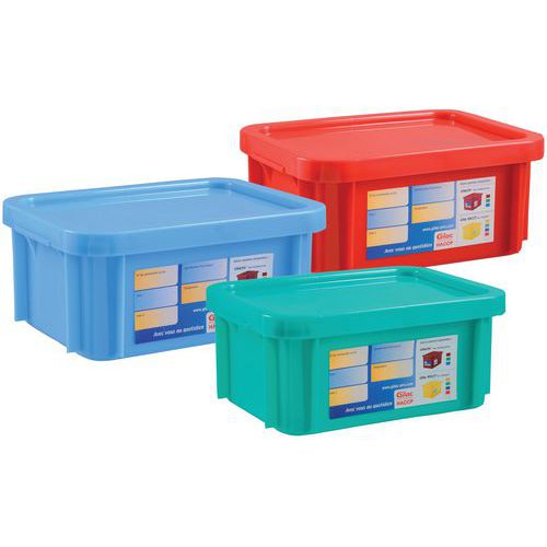 Kasse med lokk, kan stables, overholder HACCP-prinsippene for oppbevaring av næringsmidler. Tydelig merking med integrert etikett som enkelt kan viskes ut. Rød kasse for oppbevaring av kjøtt. Blå kasse for oppbevaring av marine produkter. Grønn kasse for oppbevaring av frukt og grønnsaker. En farge for hver næringsmiddeltype sikrer optimal sporbarhet for produktene. Resirkulerbart produkt.