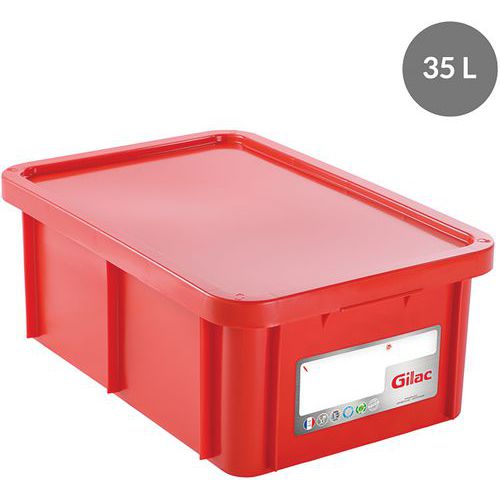 Kasse med lokk, kan stables, overholder HACCP-prinsippene for oppbevaring av næringsmidler. Tydelig merking med integrert etikett som enkelt kan viskes ut. Rød kasse for oppbevaring av kjøtt. Blå kasse for oppbevaring av marine produkter. Grønn kasse for oppbevaring av frukt og grønnsaker. En farge for hver næringsmiddeltype sikrer optimal sporbarhet for produktene. Resirkulerbart produkt.