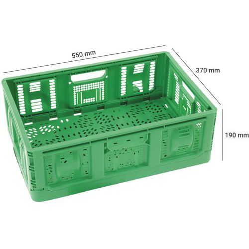 | Varenavn | Sammenleggbar plastkasse 550 mm/34 liter, Volum: 34 L, Totalhøyde: 190 mm, Totalbredde: 370 mm |