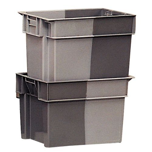 Kan stables 60% for å spare plass. Enkel håndtering med brede, ergonomiske håndtak. Glatt bunn gjør at den er kompatibel med alle typer transportbånd. Tofarget struktur gjør den enkel å stable.