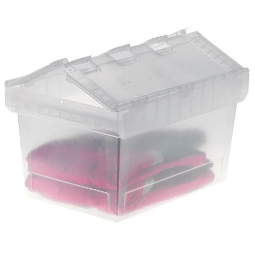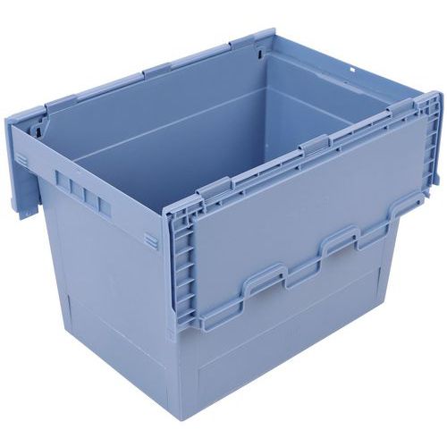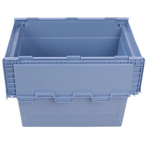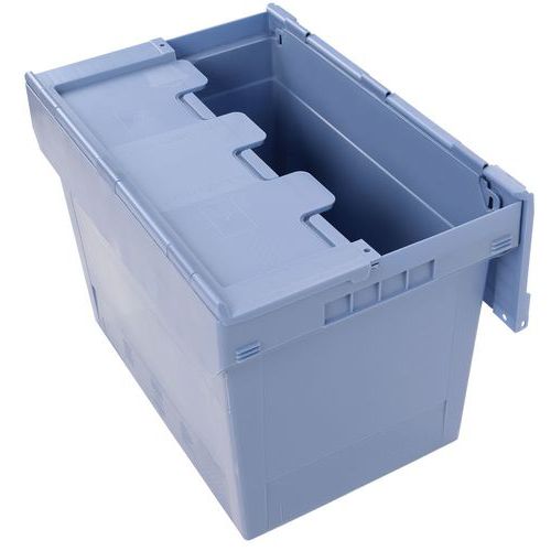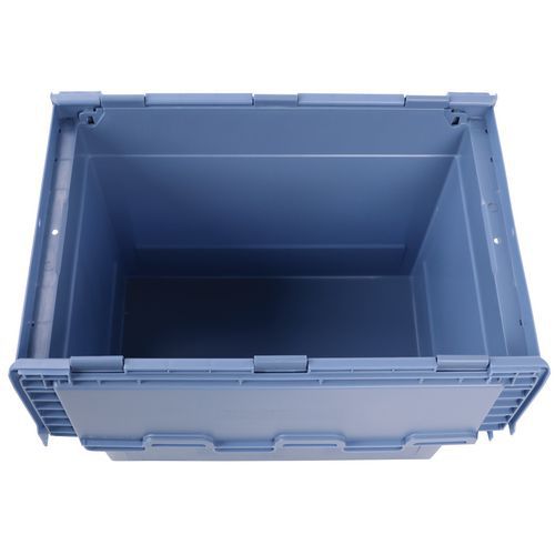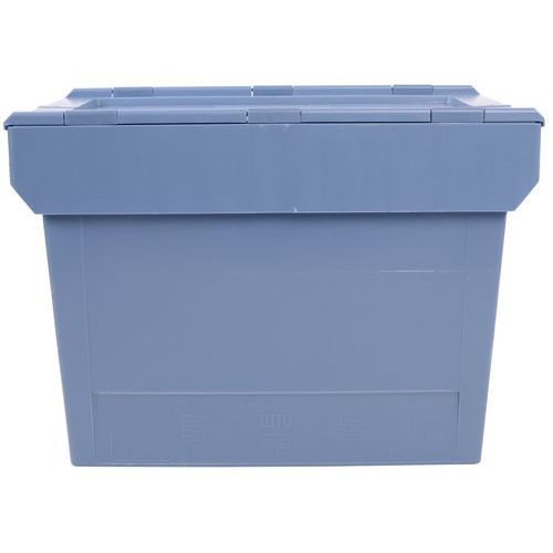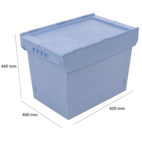 Sparer plass: både fulle og tomme kasser kan stables. Mål i henhold til europeisk standard, perfekt for transport. Mindre emballasje takket være integrert og nedfellbart lokk. Glatte innvendige vegger for maksimal utnyttelse av volumet. Husk å bestille sikkerhetsforseglinger. For intensiv bruk.