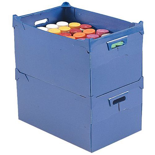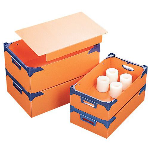 Veldig slitesterk med plastprofilforsterkede kortsider. Enkel å håndtere med håndtak og leddspor. Kassen leveres umontert. Enkel å montere med formpresset bretting.