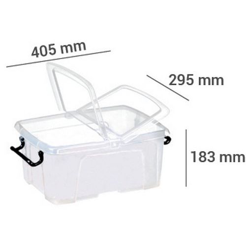 Oppbevaringsboks for dokumenter eller materialer. 2 solide klemhåndtak for effektiv lukking. Meget robust konstruksjon med 4 hele, forsterkede sider. Stabil, kan stables. Avsmalnet form som kan stables. Produsert i Storbritannia Garanti (år) : 5 år