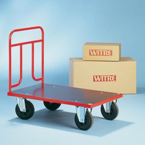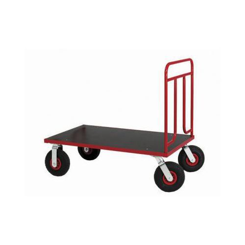 - Platåvogn/plattformvogn av høy kvalitet, helsveiset i rødlakkert stål, med plate i MDF-laminat.